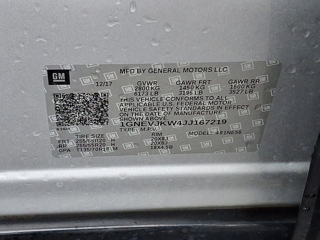 This Vehicle Includes the Following Options: Floor Liner Package (LPO) (1st & 2nd Row All-Weather Floor Liner (LPO) and 3rd Row All-Weather Floor Liner (LPO)), Front License Plate Bracket Mounting Package, Preferred Equipment Group 1LZ, Redline Edition (Black Door Handles, Dual SkyScape 2-Panel Power Sunroof, Ornamentation, and Wheels: 20 Gloss Black Painted Alum w/Red Stripes), Trailering Equipment (Heavy-Duty Cooling System), AWD, 10 Speakers, 3.49 Axle Ratio, 3rd row seats: split-bench, 4-Wheel Disc Brakes, 7-Passenger Seating (2-2-3 Seating Configuration), ABS brakes, Air Conditioning, Alloy wheels, AM/FM radio: SiriusXM, Apple CarPlay/Android Auto, Auto High-beam Headlights, Auto-dimming door mirrors, Auto-dimming Rear-View mirror, Automatic temperature control, Bose Premium 10-Speaker Audio System Feature, Brake assist, Bumpers: body-color, Compass, Delay-off headlights, Driver door bin, Driver vanity mirror, Dual front impact airbags, Dual front side impact airbags, Electronic Stability Control, Emergency communication system: OnStar Guidance, Four wheel independent suspension, Front anti-roll bar, Front Bucket Seats, Front Center Armrest, Front dual zone A/C, Front fog lights, Front reading lights, Fully automatic headlights, Garage door transmitter, Heated door mirrors, Heated front seats, Heated rear seats, Heated steering wheel, Illuminated entry, Low tire pressure warning, Memory seat, Navigation System, Occupant sensing airbag, Outside temperature display, Overhead airbag, Overhead console, Panic alarm, Passenger door bin, Passenger vanity mirror, Perforated Leather-Appointed Seat Trim, Power door mirrors, Power driver seat, Power Liftgate, Power passenger seat, Power steering, Power windows, Premium audio system: Chevrolet MyLink, Radio data system, Radio: Chevrolet MyLink AM/FM Stereo w/Navigation, Rear air conditioning, Rear anti-roll bar, Rear reading lights, Rear window defroster, Rear window wiper, Remote keyless entry, Roof rack: rails only, Security system, SiriusXM Satellite Radio, Speed control, Speed-sensing steering, Spoiler, Steering wheel memory, Steering wheel mounted audio controls, Tachometer, Telescoping steering wheel, Tilt steering wheel, Traction control, Trip computer, Turn signal indicator mirrors, Variably intermittent wipers, Ventilated front seats, Voltmeter, Wheel Locks, and Wheels: 20 Argent Metallic Machine Faced Aluminum.