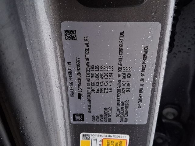 This Vehicle Includes the Following Options: Heavy-Duty Trailering Package (2-Speed Active Transfer Case, Extra Capacity Cooling System, Trailer Tire Pressure Monitoring System, Trailering Assist Guidelines, and Wired Auxiliary Trailer Camera (LPO)), Performance Package (Electronic Limited-Slip Differential, Hitch Guidance w/Hitch View, Integrated Trailer Brake Controller, Magnetic Ride Control Suspension, Smart Trailer Integration Indicator, and Trailer Side Blind Zone Alert), Preferred Equipment Group 1SB (Adaptive Cruise Control, AKG Studio 19-Speaker Audio System, Automatic Seat Belt Tightening, Automatic Stop/Start, Door Lock & Latch Shields, Enhanced Automatic Emergency Braking, Enhanced Automatic Parking Assist, Glass Breakage Sensor, Lane Change Alert w/Side Blind Zone Alert, Mechanical Limited-Slip Differential, Power Panoramic Tilt-Sliding Sunroof, Rear Camera Mirror, Rear Camera Mirror Washer, Rear Cross Traffic Alert, Reconfigurable Full-Color Head-Up Display, Reverse Automatic Braking, Running Board Assist Steps, Start/Stop System Disable Button, Theft-Deterrent Alarm System, Vehicle Inclination Sensor, and Vehicle Interior Movement Sensor), Touring Package (Air Ride Adaptive Suspension, Illuminating Front & Rear Sill Plates, and Soft Closing Front & Rear Doors), 4WD, Parchment With Jet Black Accents Leather, 16.9 Diagonal OLED Infotainment Screen, 19 Speakers, 2-Presets Memory For Driver Seat Adjuster, 3.23 Axle Ratio, 3rd row seats: split-bench, 4-Wheel Disc Brakes, 8-Way Power Driver Seat Adjuster, 8-Way Power Front Passenger Seat Adjuster, ABS brakes, Air Conditioning, AKG Studio Reference 36-Speaker Audio System, Alloy wheels, AM/FM radio: SiriusXM with 360L, Apple CarPlay/Android Auto, Audio memory, Auto High-beam Headlights, Auto tilt-away steering wheel, Auto-dimming door mirrors, Auto-dimming Rear-View mirror, Automatic temperature control, Brake assist, Bumpers: body-color, Compass, Delay-off headlights, Driver door bin, Driver vanity mirror, Dual front impact airbags, Dual front side impact airbags, Electronic Stability Control, Emergency communication system: OnStar and Cadillac connected services capable, Four wheel independent suspension, Front anti-roll bar, Front Bucket Seats, Front Center Armrest w/Storage, Front dual zone A/C, Front reading lights, Fully automatic headlights, Garage door transmitter, HD Radio, Heads-Up Display, Heated & Ventilated Driver & Front Passenger Seats, Heated door mirrors, Heated Driver & Front Passenger Seats, Heated front seats, Heated rear seats, Heated steering wheel, Illuminated entry, Leather Seating Surfaces w/Mini-Chevron Perf Inserts, Leather steering wheel, Low tire pressure warning, Memory seat, Navigation System, Night Vision, Not Equipped w/4-Way Driver & Fr Pass Pwr Lumbar, Not Equipped w/Steering Column Lock, Occupant sensing airbag, Outside temperature display, Overhead airbag, Overhead console, Panic alarm, Passenger door bin, Passenger vanity mirror, Power door mirrors, Power driver seat, Power Liftgate, Power moonroof, Power passenger seat, Power steering, Power windows, Power-Retractable Assist Steps, Premium Smooth Ride Suspension, Radio data system, Radio: AM/FM/SiriusXM w/Navigation, Rain sensing wipers, Rear air conditioning, Rear anti-roll bar, Rear reading lights, Rear window defroster, Rear window wiper, Remote keyless entry, Roof rack: rails only, Security system, SiriusXM w/360L, Speed control, Split folding rear seat, Spoiler, Steering wheel memory, Steering wheel mounted audio controls, Super Cruise, Tachometer, Teen Driver, Telescoping steering wheel, Tilt steering wheel, Traction control, Trip computer, Turn signal indicator mirrors, Variably intermittent wipers, Ventilated front seats, Voltmeter, Wheels: 22 14-Spoke Alloy w/Polished Finish, and Wireless Apple CarPlay/Wireless Android Auto.